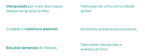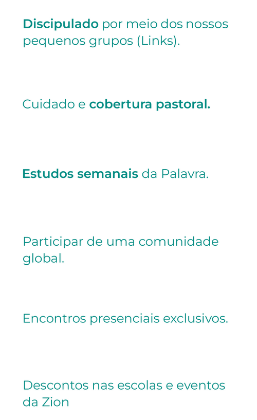 Acreditamos na importância da união ao Corpo de Cristo na nossa jornada espiritual (Pv 27:17; Rm 12:4-5; Ef 4:11-16; Hb 10:24-25). Se você entende que a Zion Church é a sua igreja, pode se tornar um Membro Online e ter acesso a